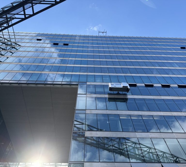 Im Rahmen einer umfassenden Sanierung werden alle Fassadenscheiben erneuert. Über vier separate Befahranlagen werden die großflächigen Glaselemente zunächst auf das Dach transportiert, dort gelagert und im Anschluss fachgerecht an ihren neuen Positionen montiert. Auch das charakteristische Glasvordach wird vollständig ersetzt – die Arbeiten erfolgen unter umfassender Gerüstabsicherung.